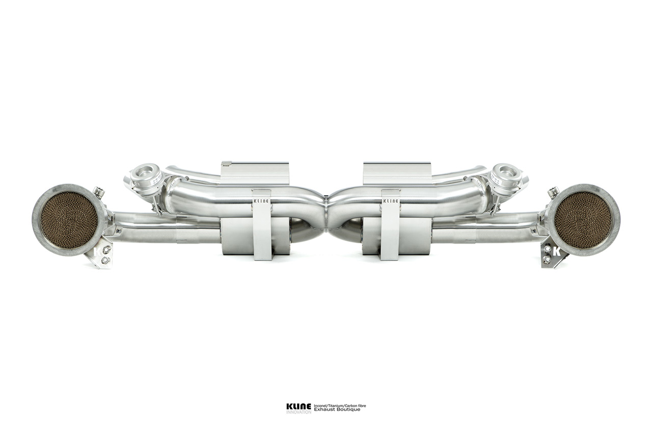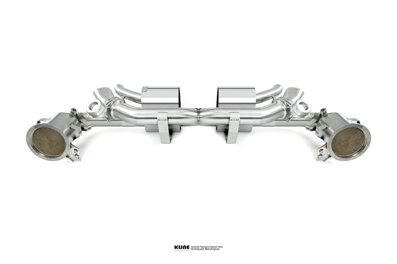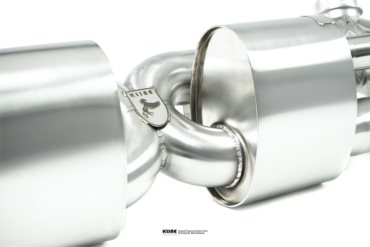 Removal of the heavy chambered rear silencer, and replacing it with a lightweight F1 grade Inconel 625 X pipe, and Fully bypassable lightweight Inconel silencers, sheds a significant amount of weight, as well as raising the pitch of the exhaust into a more exotic tonal range. Removal of the OPF and catalysts, and replacing them with either HJS motorsport catalysts, or De-cat pipes, opens the sound up significantly, complementing and accentuating the high pitched silencer section, into an exotic scream. The Kline innovation rear valvetronic setup, means that the car can be driven in stealth mode with the valves closed, however a raw unhindered sound can be achieved with valves open. Addition of our beautifully crafted F1 grade Pre Preg carbon fiber exhaust tips complemets the exhaust perfectly.
