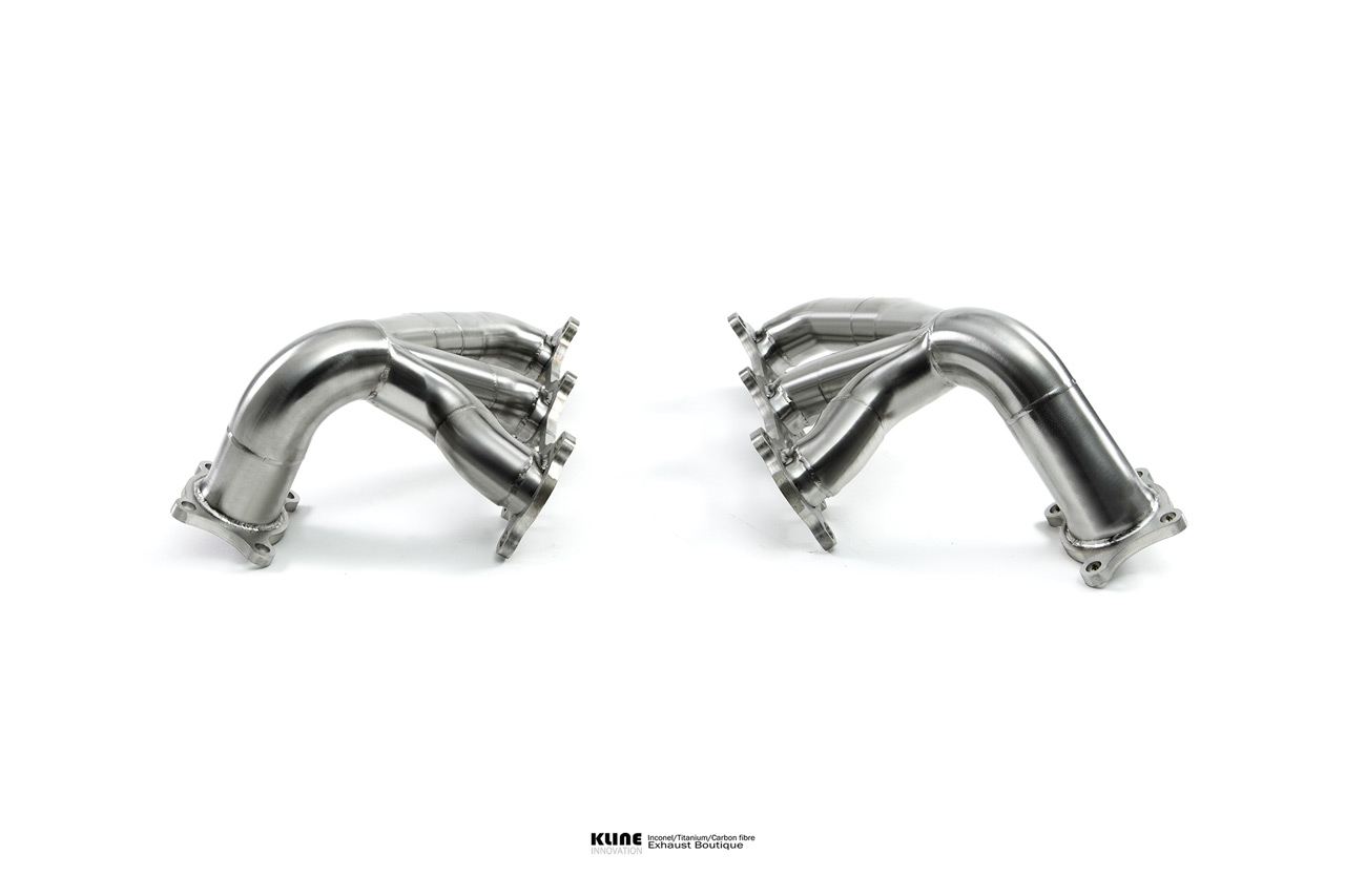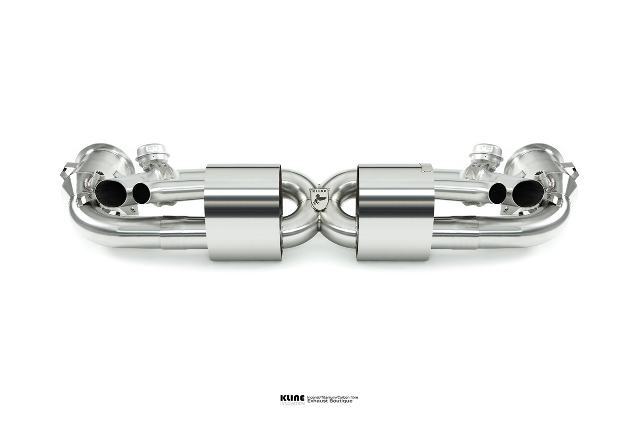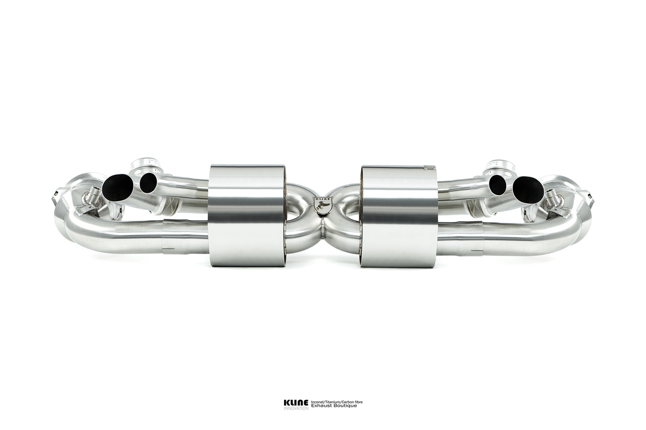Removal of the heavy chambered rear silencer, and replacing it with a lightweight F1 grade Inconel 625 X pipe, and Fully bypassable lightweight Inconel silencers, sheds a significant amount of weight, as well as raising the pitch of the exhaust into a more exotic tonal range. Removal of the OPF and catalysts, and replacing them with either HJS motorsport catalysts, or De-cat pipes, opens the sound up significantly, complementing and accentuating the high pitched silencer section, into an exotic scream. The Kline innovation rear valvetronic setup, means that the car can be driven in stealth mode with the valves closed, however a raw unhindered sound can be achieved with valves open. Addition of our beautifully crafted F1 grade Pre Preg carbon fiber exhaust tips complemets the exhaust perfectly.