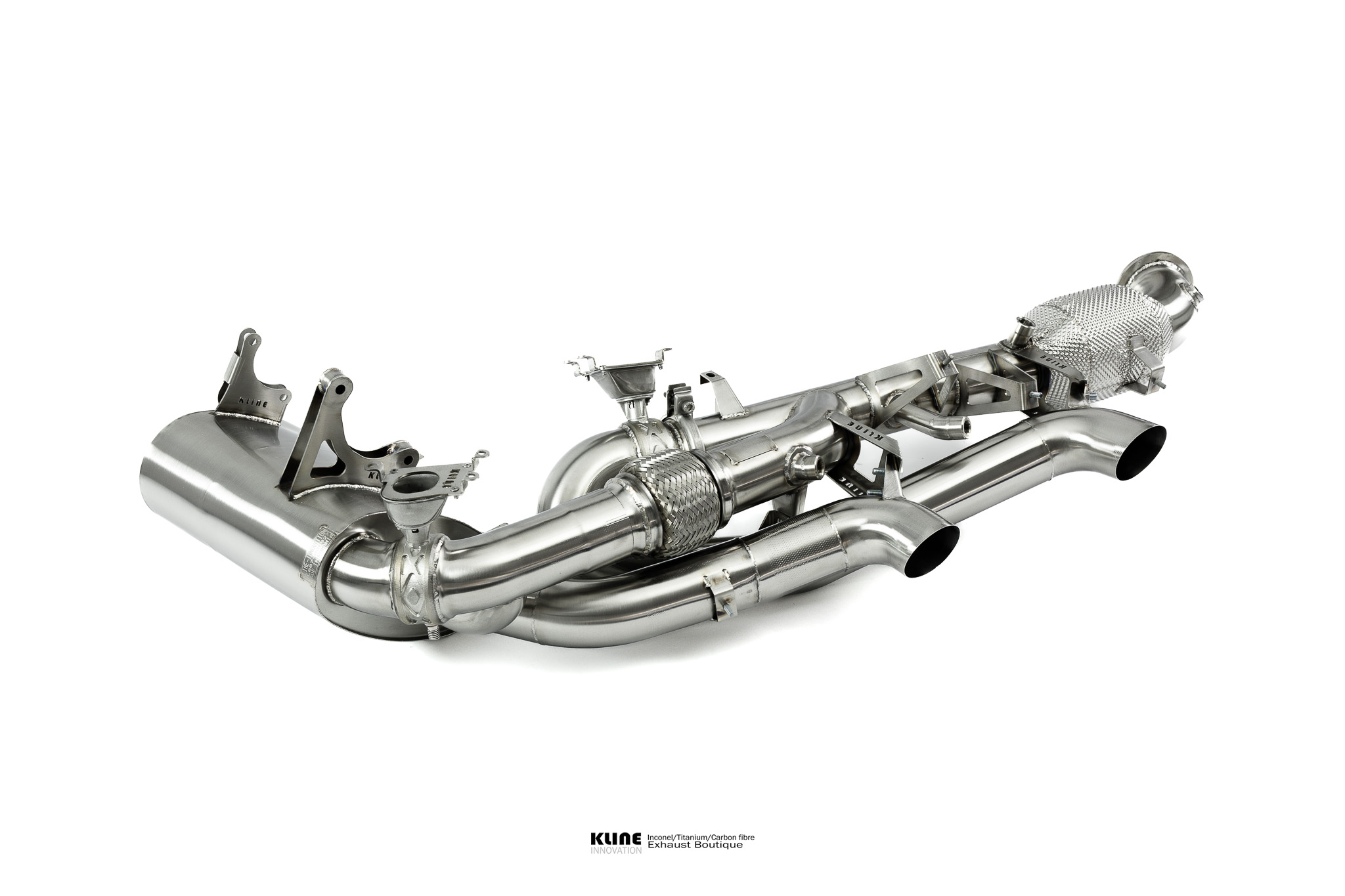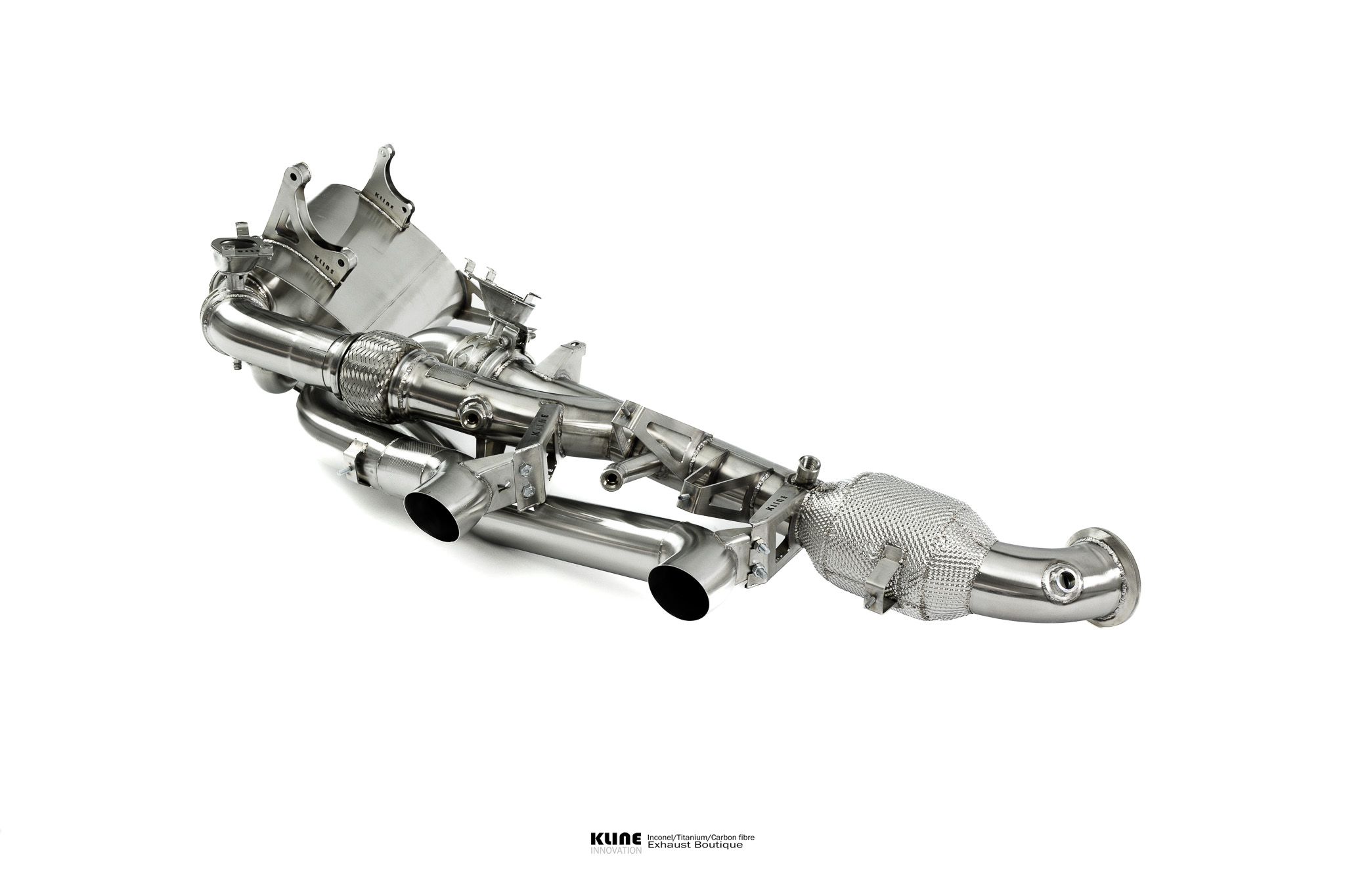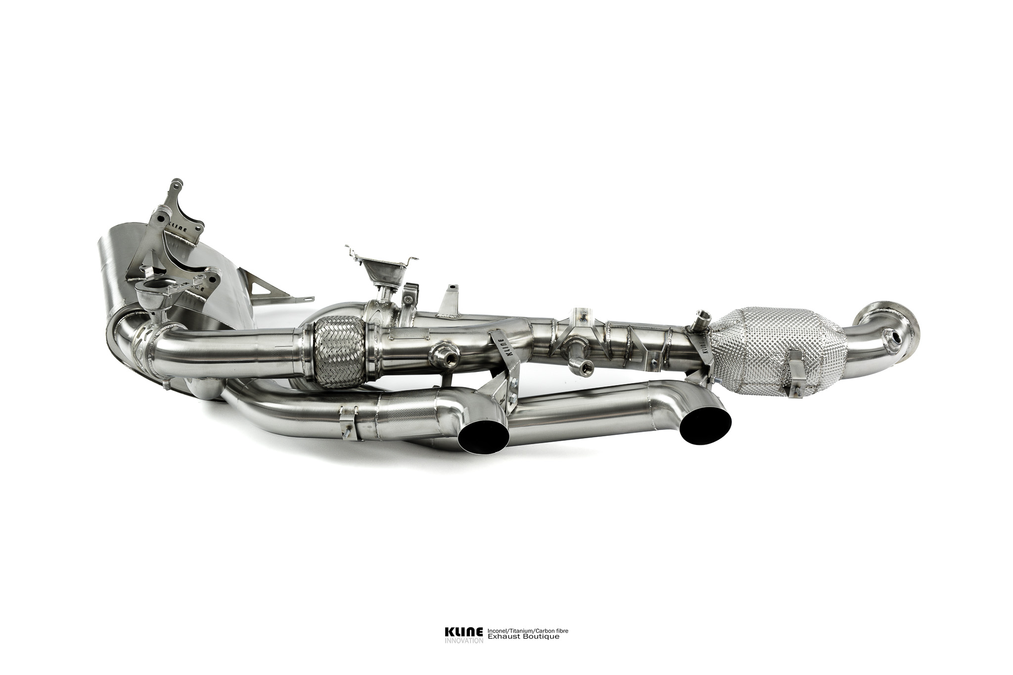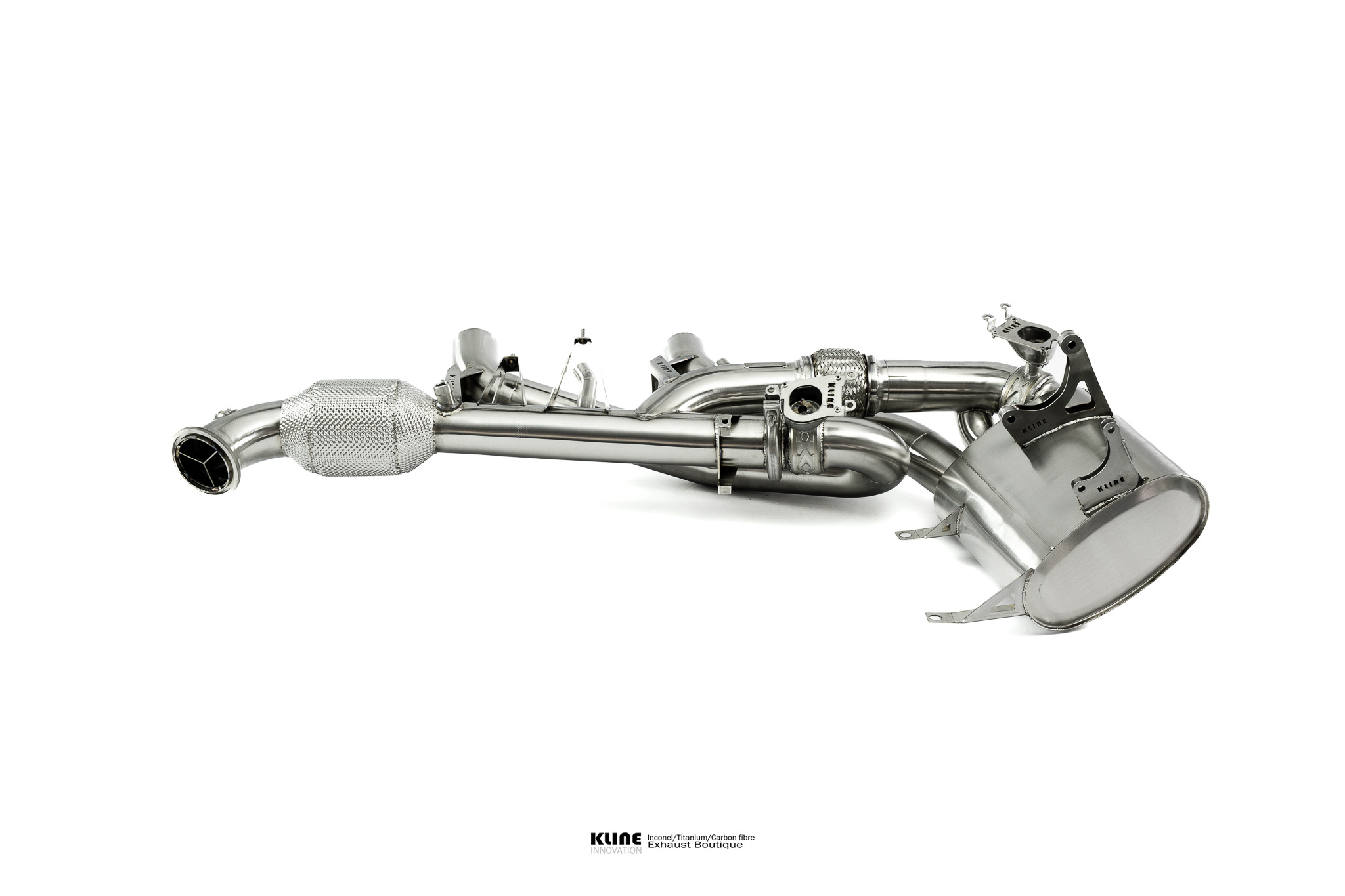 Removal of the heavy chambered rear silencer, and replacing it with a lightweight F1 grade Inconel 625 X pipe, and Fully bypassable lightweight Inconel silencers, sheds a significant amount of weight, as well as raising the pitch of the exhaust into a more exotic tonal range. Removal of the OPF and catalysts, and replacing them with either HJS motorsport catalysts, or De-cat pipes, opens the sound up significantly, complementing and accentuating the high pitched silencer section, into an exotic scream. The Kline innovation rear valvetronic setup, means that the car can be driven in stealth mode with the valves closed, however a raw unhindered sound can be achieved with valves open. Addition of our beautifully crafted F1 grade Pre Preg carbon fiber exhaust tips complemets the exhaust perfectly.