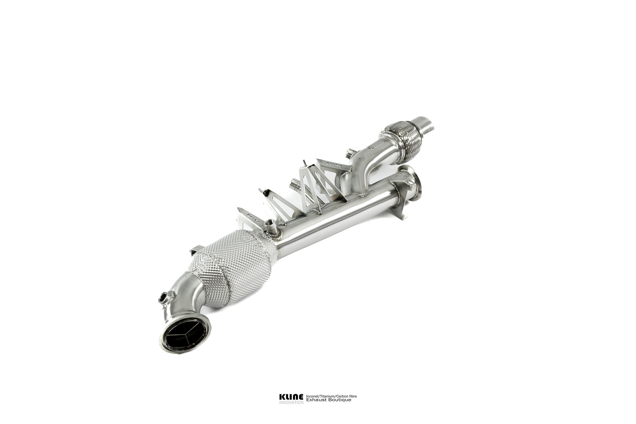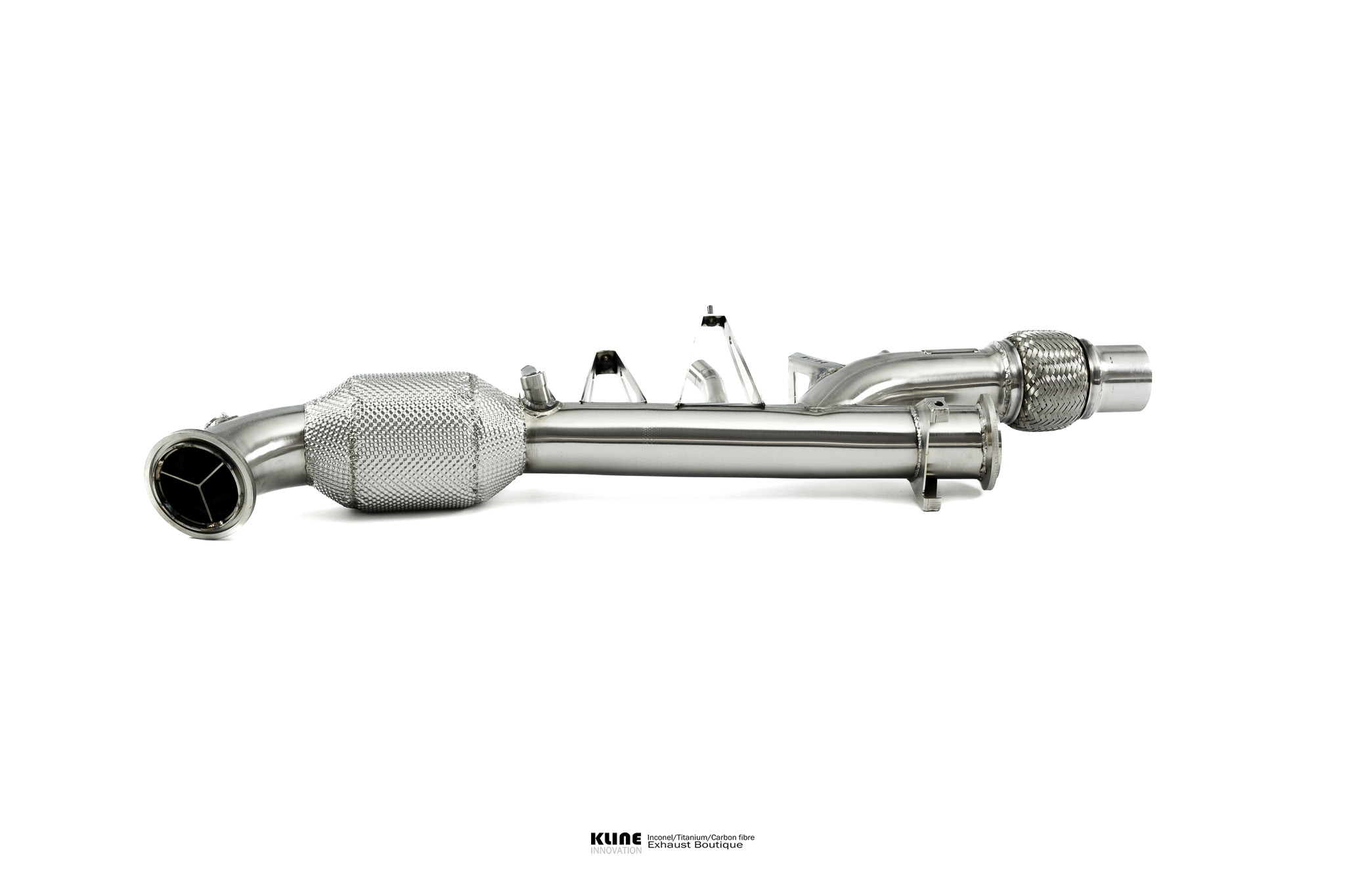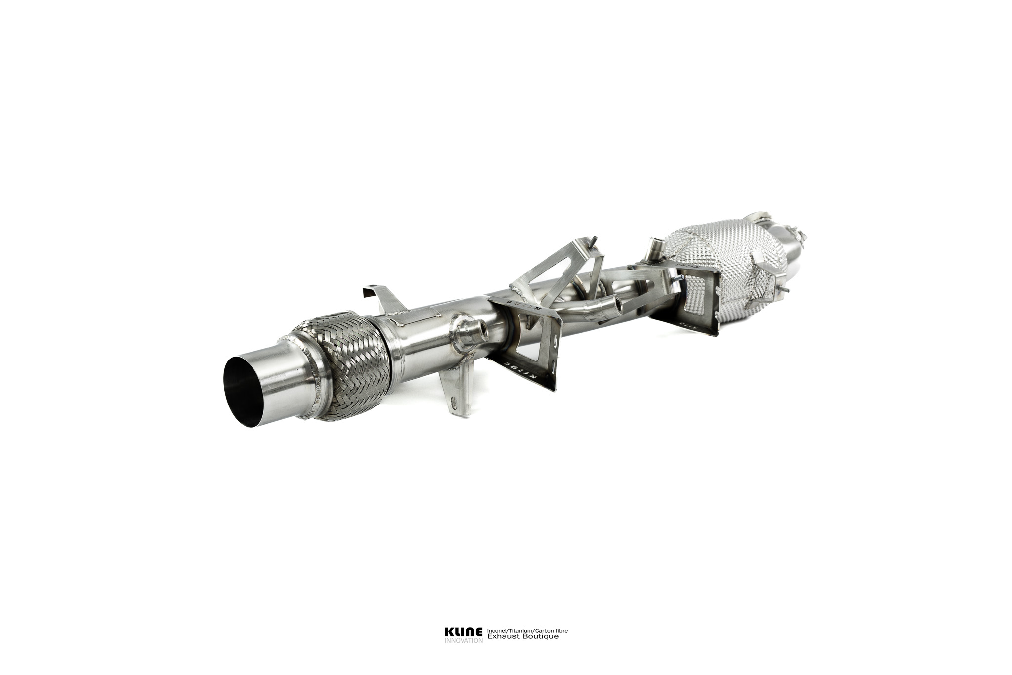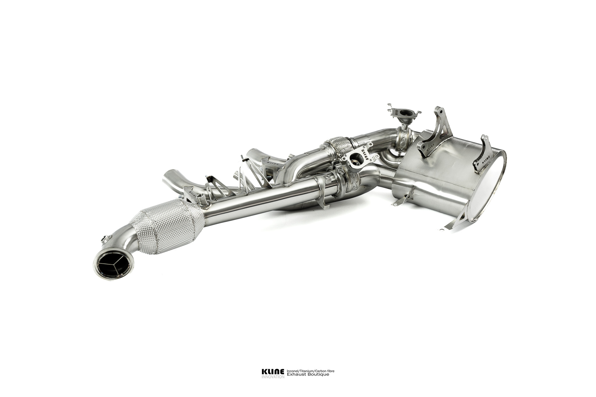 Removal of the heavy chambered rear silencer, and replacing it with a lightweight F1 grade Inconel 625 X pipe, and Fully bypassable lightweight Inconel silencers, sheds a significant amount of weight, as well as raising the pitch of the exhaust into a more exotic tonal range. Removal of the OPF and catalysts, and replacing them with either HJS motorsport catalysts, or De-cat pipes, opens the sound up significantly, complementing and accentuating the high pitched silencer section, into an exotic scream. The Kline innovation rear valvetronic setup, means that the car can be driven in stealth mode with the valves closed, however a raw unhindered sound can be achieved with valves open. Addition of our beautifully crafted F1 grade Pre Preg carbon fiber exhaust tips complemets the exhaust perfectly.