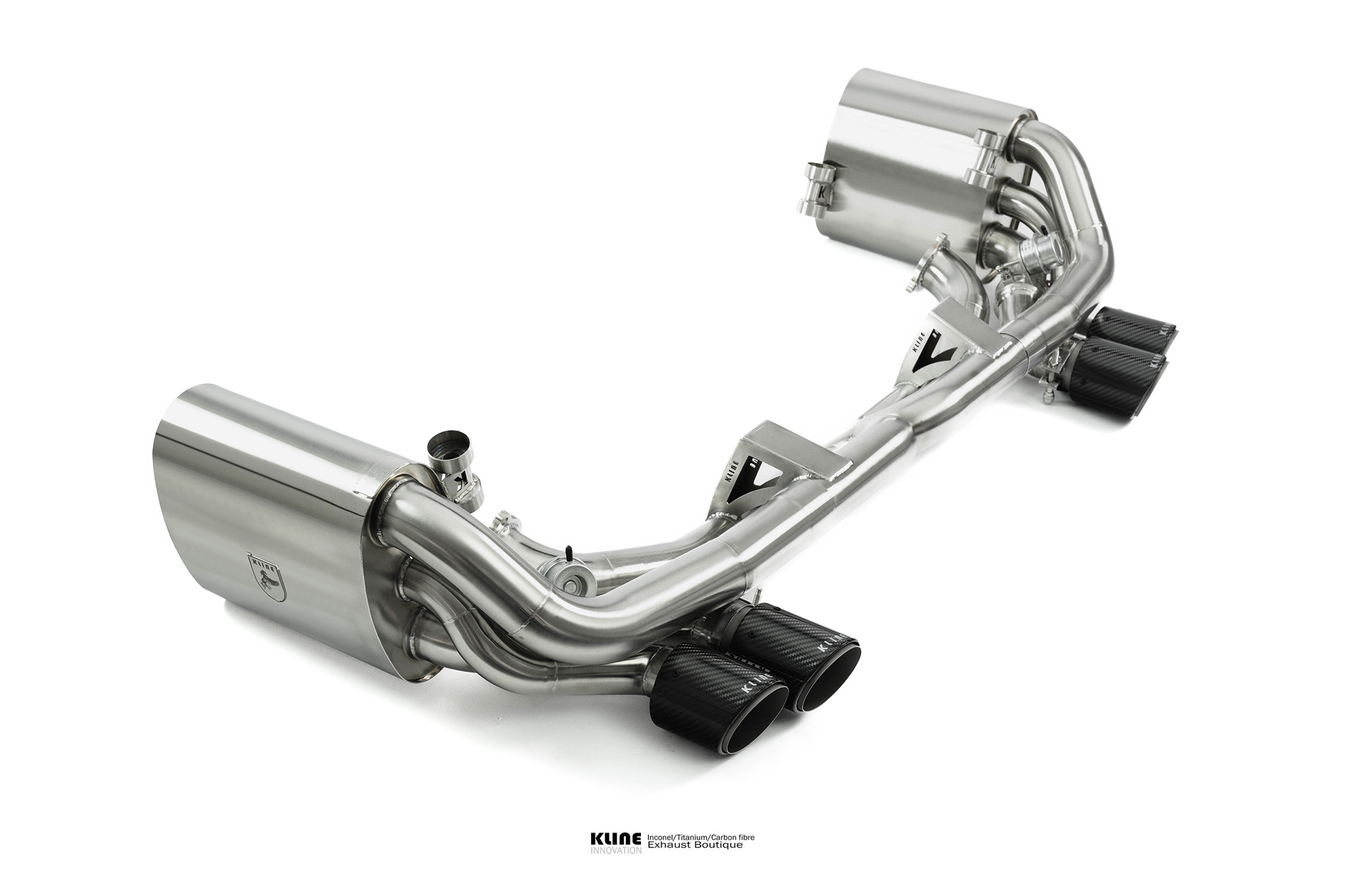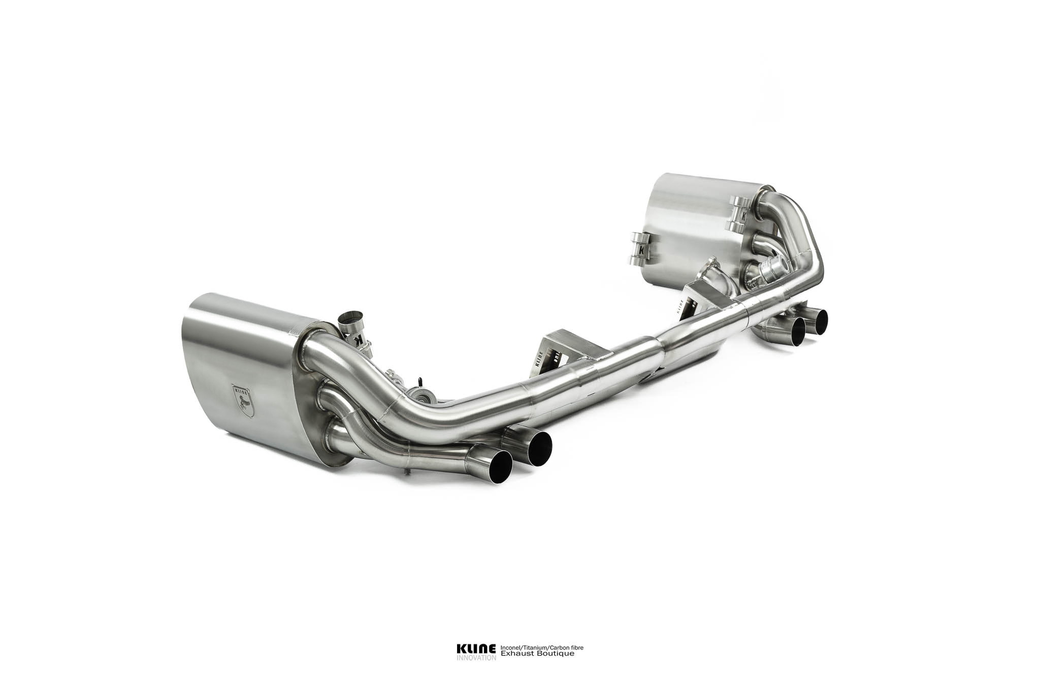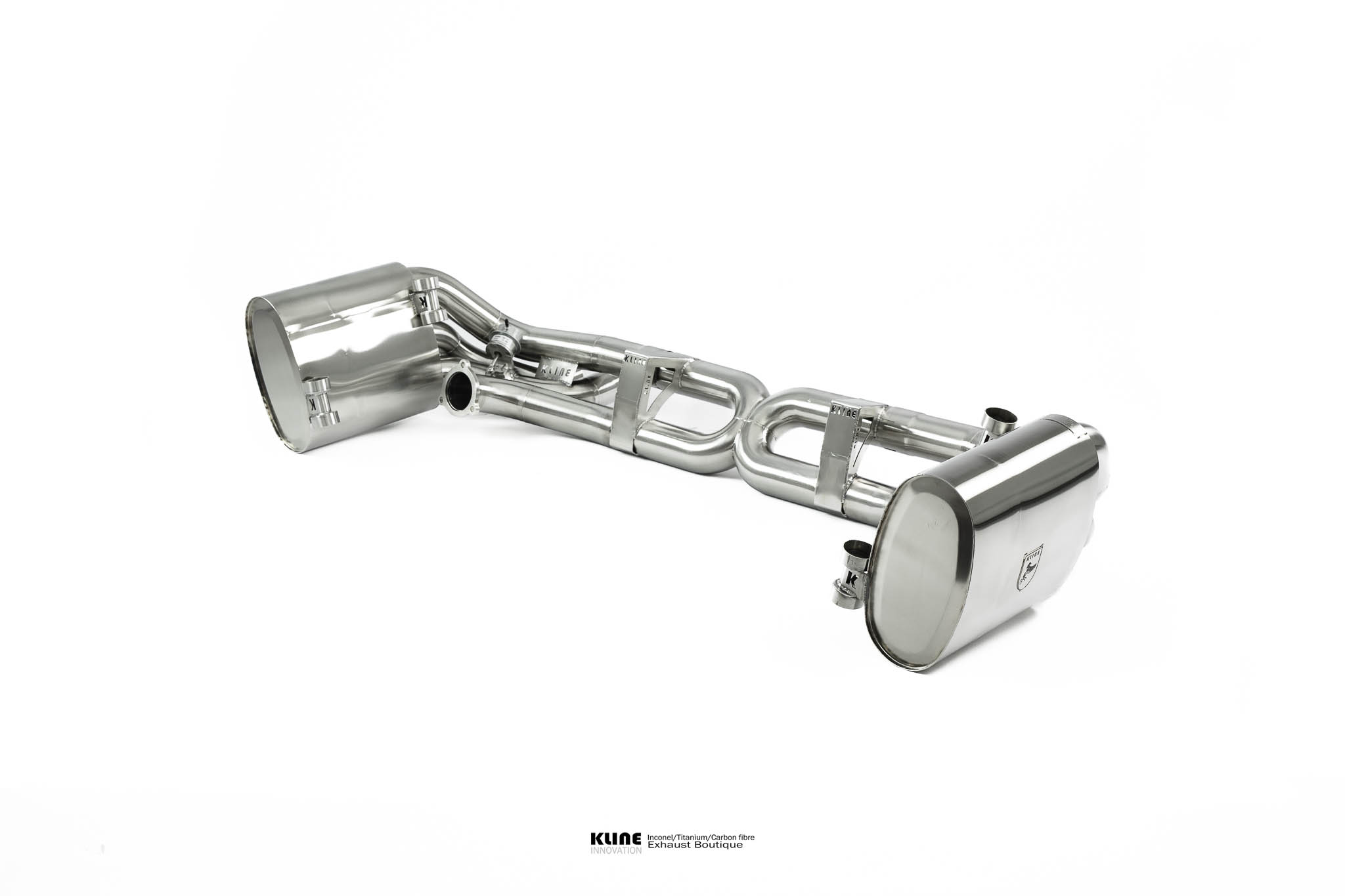 Starting at the manifolds, replacing the stock cats for our 100 cell, or long tube catless Inconel headers opens up the sound significantly. The gases are then passed through one of 2 channels. On valve closed, the gases pass through our harmonically tuned, and internally ceramic insulated wing silencers to remove unwanted drone during highway cruising, and into the center muffler, and finally our trademark 1D CLR x pipe, this setup keeps the car very civilised when you want it to be. On valve open The wing and center silencers are completely bypassed, allowing the gasses to pass freely through the exhaust system. The geometry of the Kline 1D CLR X pipe raises the pitch of the exhaust significantly into a raucous, yet beautiful, incindiary scream, without causing any restriction to the gas transit. The material Inconel 625 also has a unique sound, further enhancing the natural charachteristic sound of the kline system. The sidewall is very thin, and resonates to produce an even higher pitched scream at high revs.