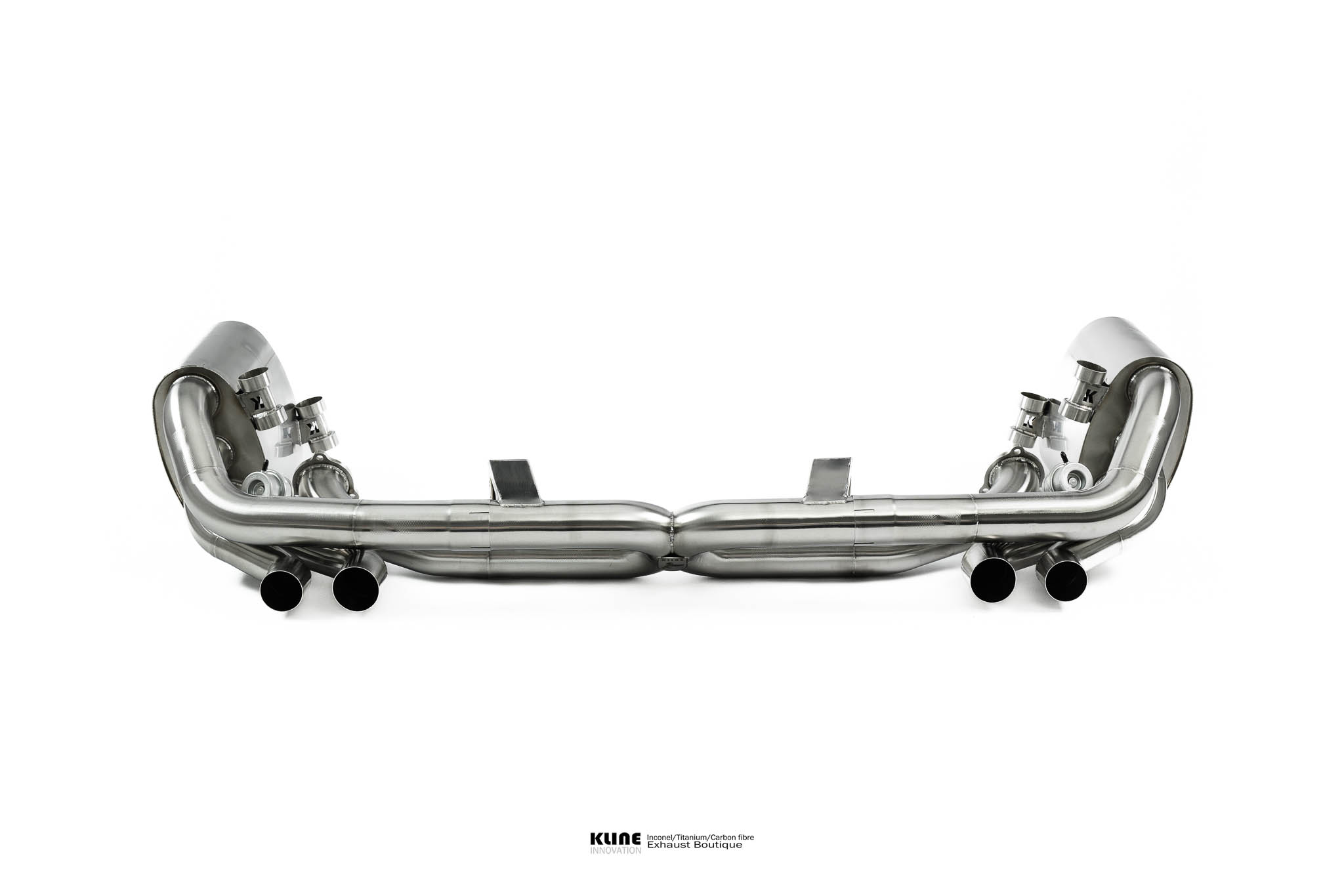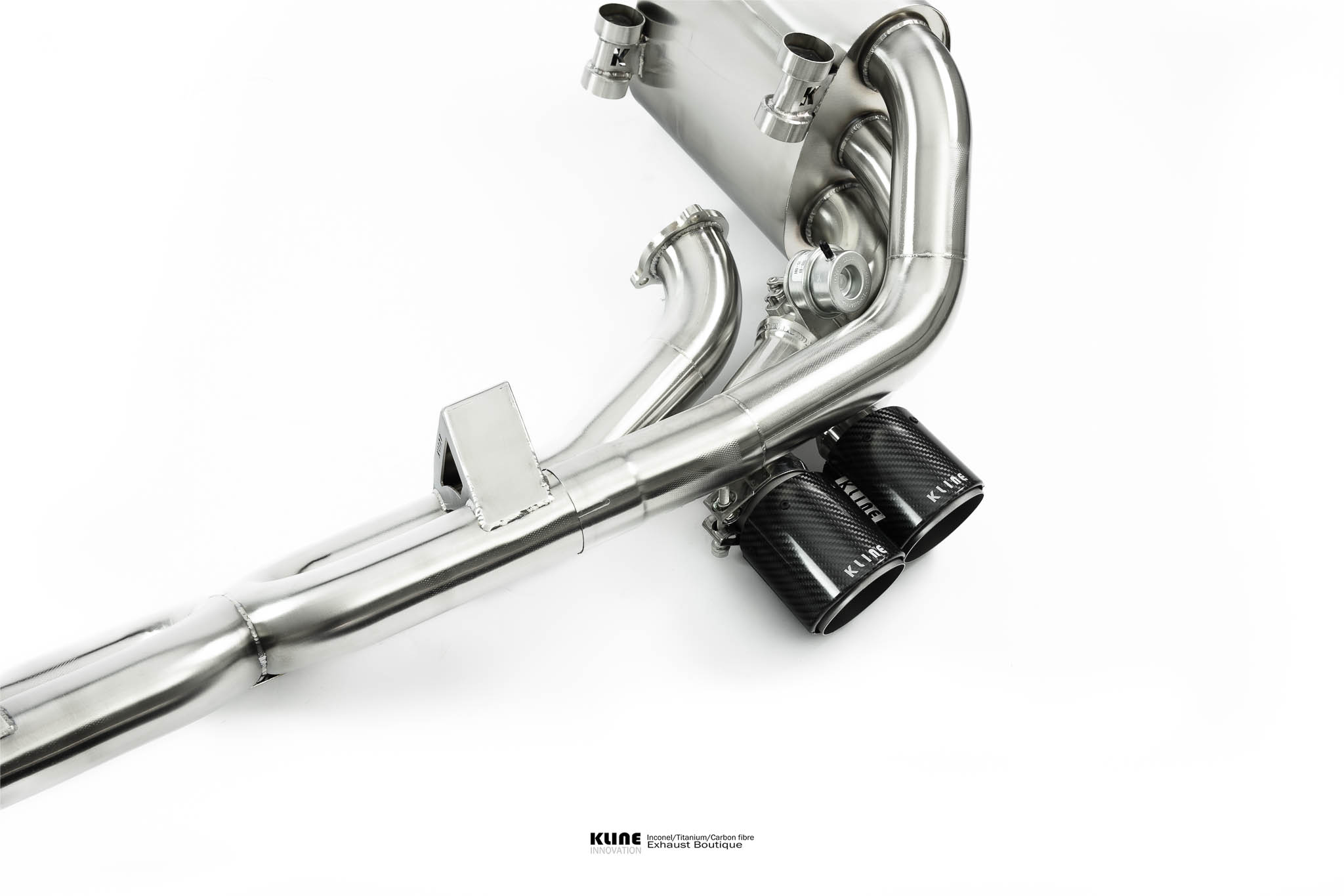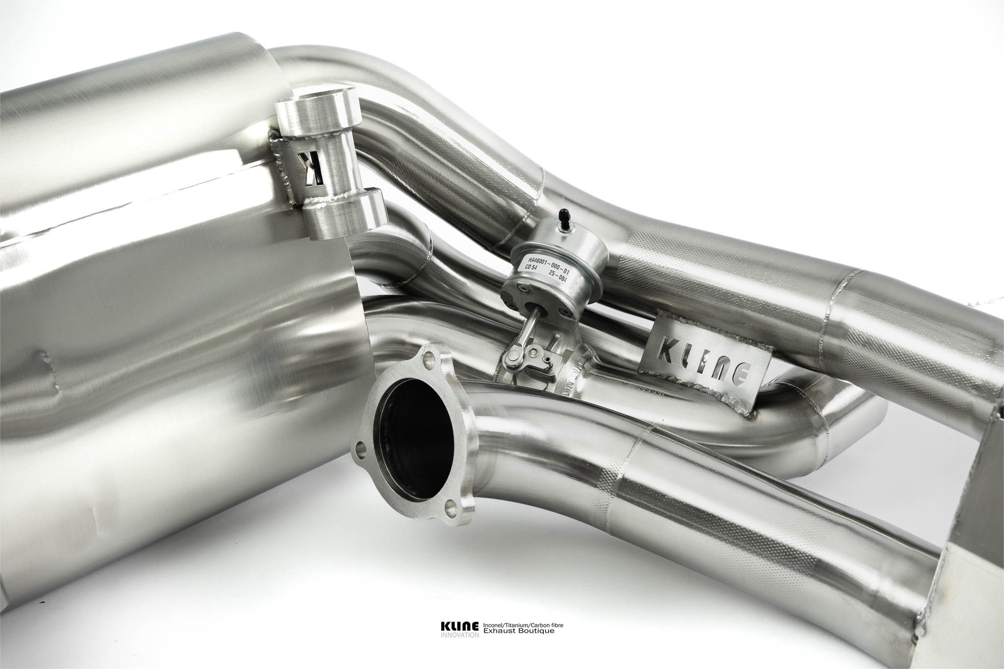 Starting at the manifolds, replacing the stock cats for our 100 cell, or long tube catless Inconel headers opens up the sound significantly. The gases are then passed through one of 2 channels. On valve closed, the gases pass through our harmonically tuned, and internally ceramic insulated wing silencers to remove unwanted drone during highway cruising, and into the center muffler, and finally our trademark 1D CLR x pipe, this setup keeps the car very civilised when you want it to be. On valve open The wing and center silencers are completely bypassed, allowing the gasses to pass freely through the exhaust system. The geometry of the Kline 1D CLR X pipe raises the pitch of the exhaust significantly into a raucous, yet beautiful, incindiary scream, without causing any restriction to the gas transit. The material Inconel 625 also has a unique sound, further enhancing the natural charachteristic sound of the kline system. The sidewall is very thin, and resonates to produce an even higher pitched scream at high revs.